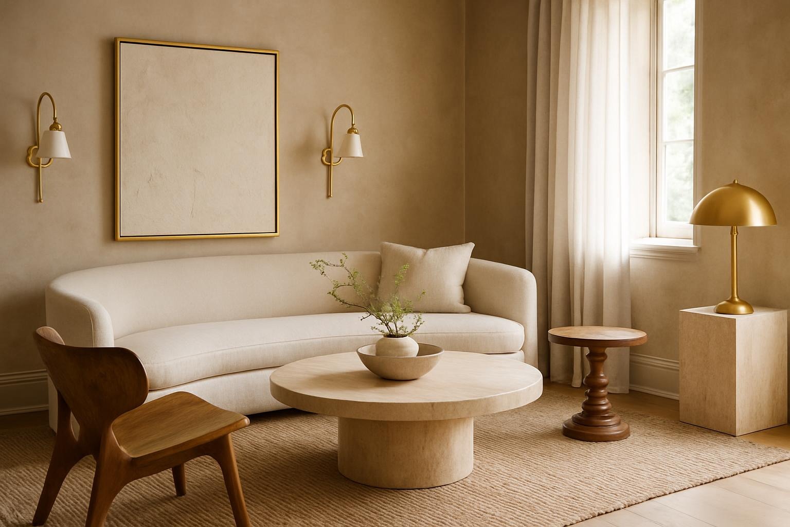 A refined blend of natural textures and golden accents creates a welcoming sanctuary bathed in soft light.